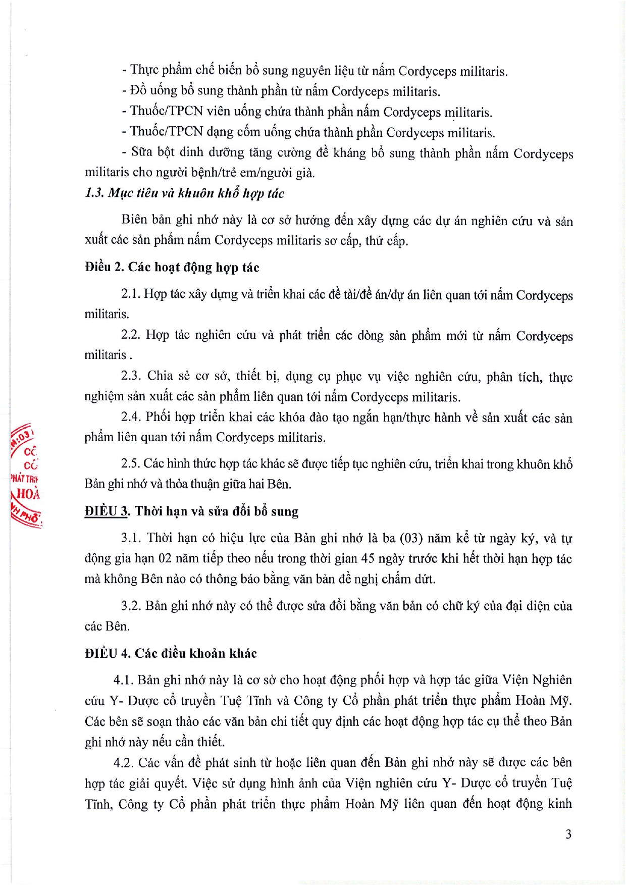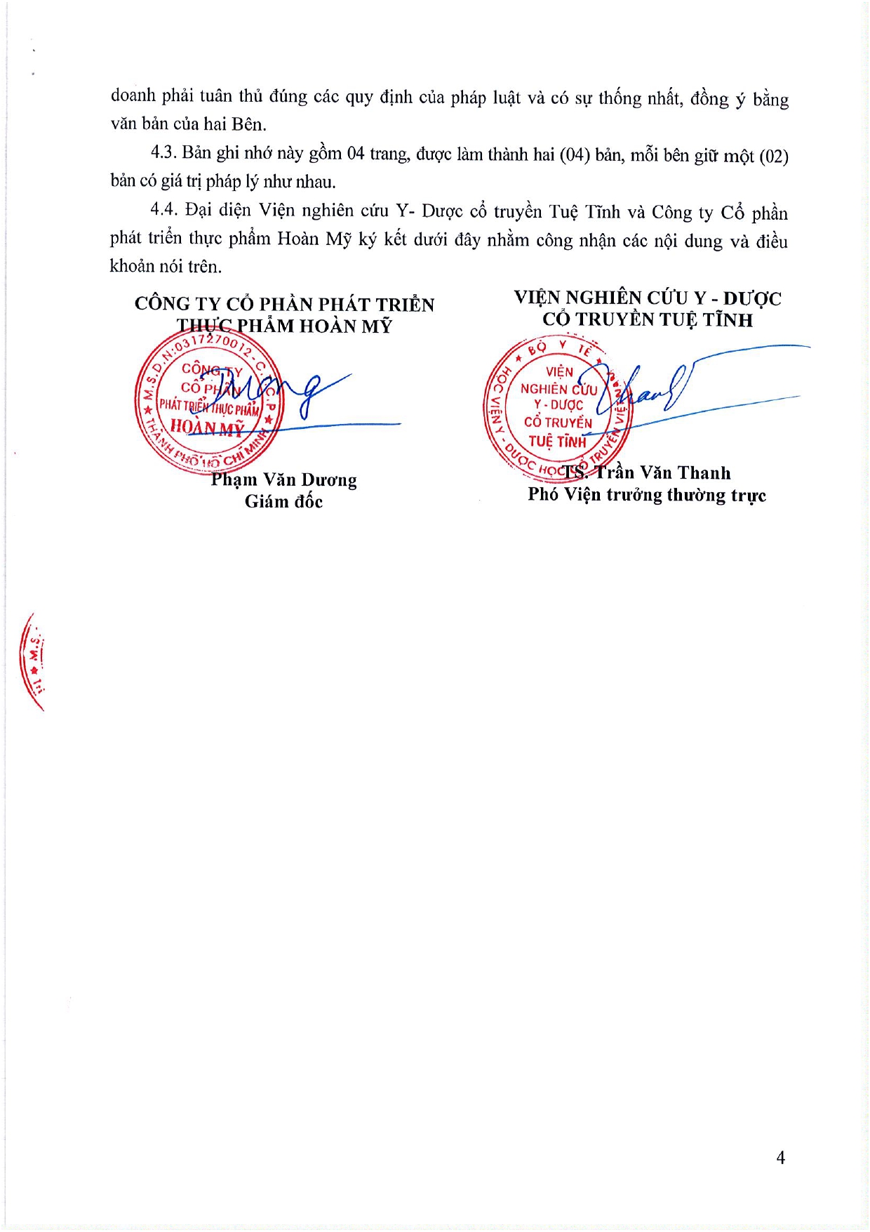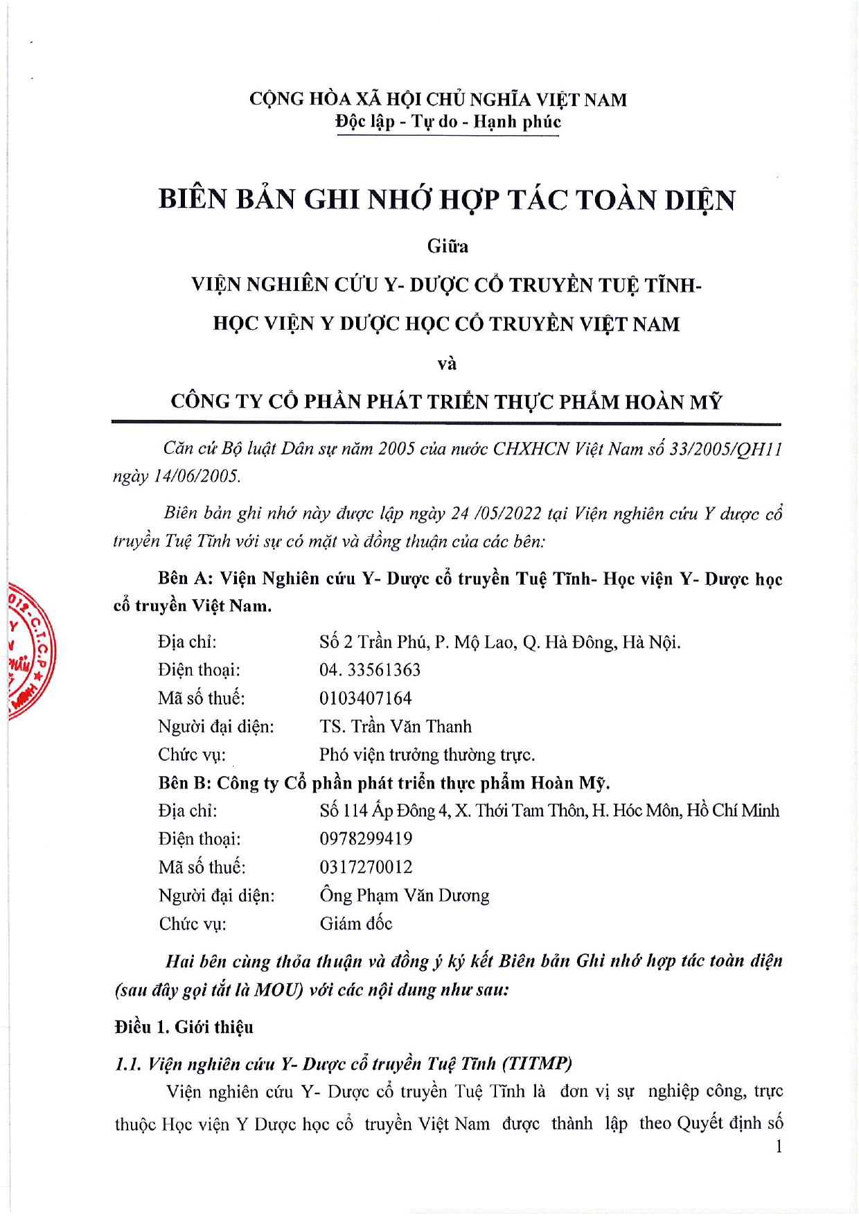 Biên bản ghi nhớ hợp tác toàn diện giữa Công ty Cổ phần phát triển thực phẩm Hoàn Mỹ và Viện Nghiên cứu Y - Dược Cổ truyền Tuệ Tĩnh, Học viện Y dược học Cổ truyền Việt Nam"16:51 - 25/11/2022Đối tác, Chia sẻ: