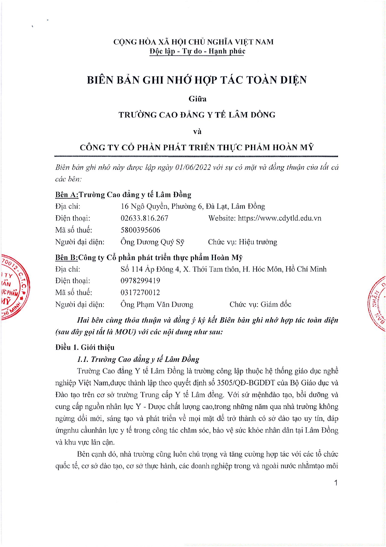 Biên bản ghi nhớ hợp tác toàn diện giữa trường cao đẳng y tế Lâm Đồng và Công ty cổ phần phát triển thực phẩm Hoàn Mỹ10:51 - 15/12/2022Đối tác, Chia sẻ: